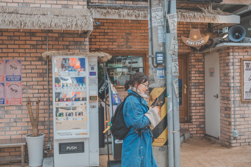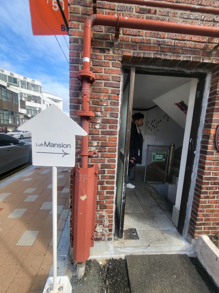 Rennovated old Korean villa into a cafe/shop, you can still feel the old style construction and spot the red bricks. Interesting “We Are Open” sign.