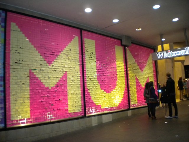 Post-it of pink and yellow were on the shop window and people could write their personal messages to mums. I guess this kind of event is only possible in few countries (like NZ!) as they are displayed outside the shop. I was surprised by how poeple respect this decoration and participate in the event rather than removing them out or playing by destroying them.