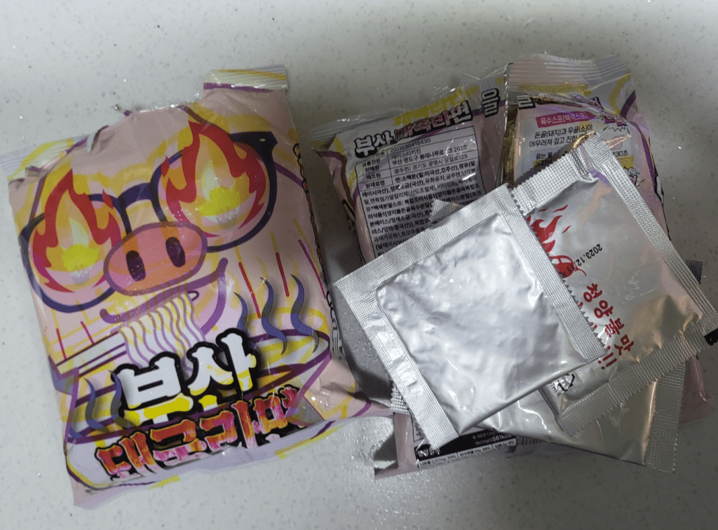 This new ramyeon packaging caught my eyes, something I had never seen before, and I have to try new things. Curiosity hits. Whoever designed the packaging is very creative, I can already sense it is going to be spicy. Different to typical Korean ramyeon, it represents Busan’s famous 국밥 (Gugbap, pork, and rice soup) but with noodles instead.