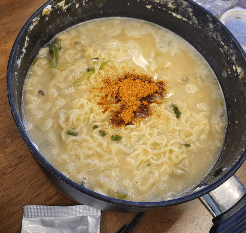 Taste: recommended, agree it is fire spicy when you put 4/4 powder sauce to it, you can also taste the 국밥 base. After noodles, I even put a bowl of rice to the soup to finish it off.