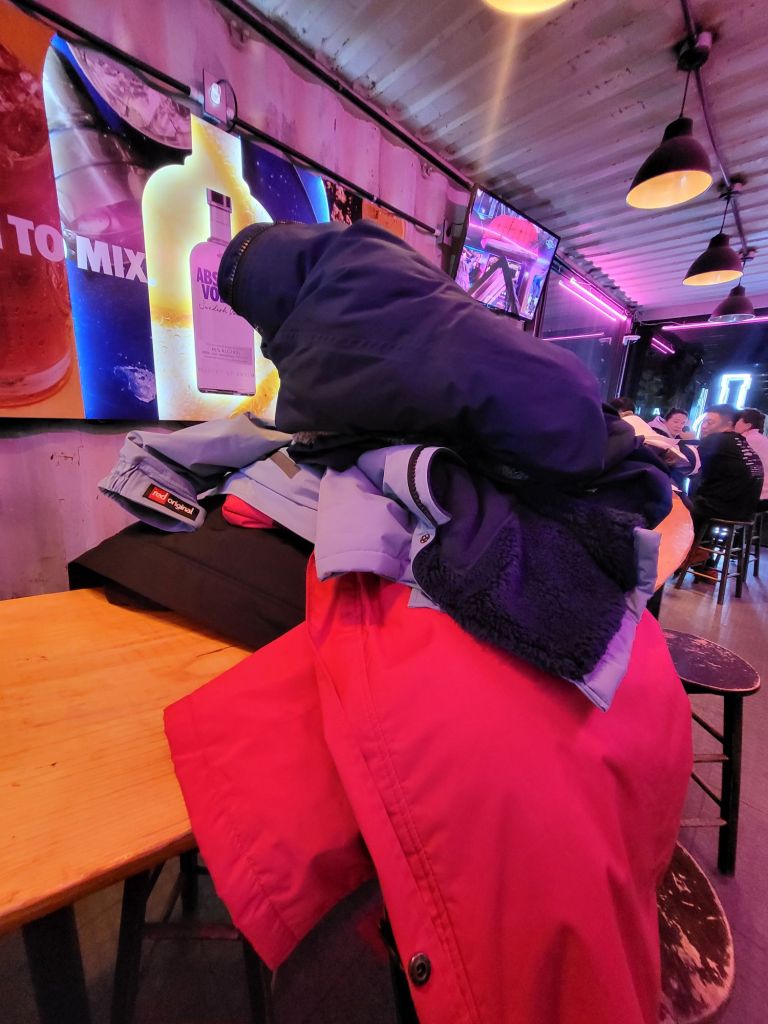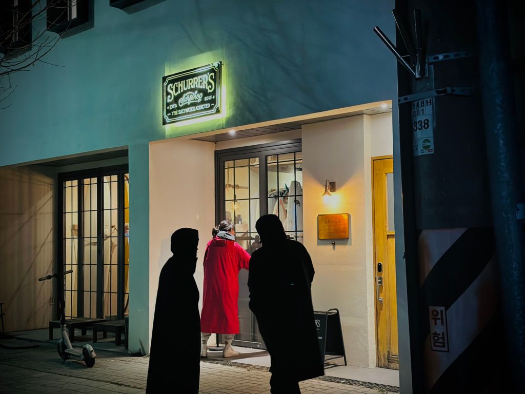 After surfing: red original surfing jackets and a glass of tap beer. Found one cozy looking bar concept store SCHURRER’S but there were no seats available except bar stool. Yangyang is also popular among tourists, bikers and couples so it was expected. Then found another bar called pleasewait and they offer beers, cocktails and other beverages.
