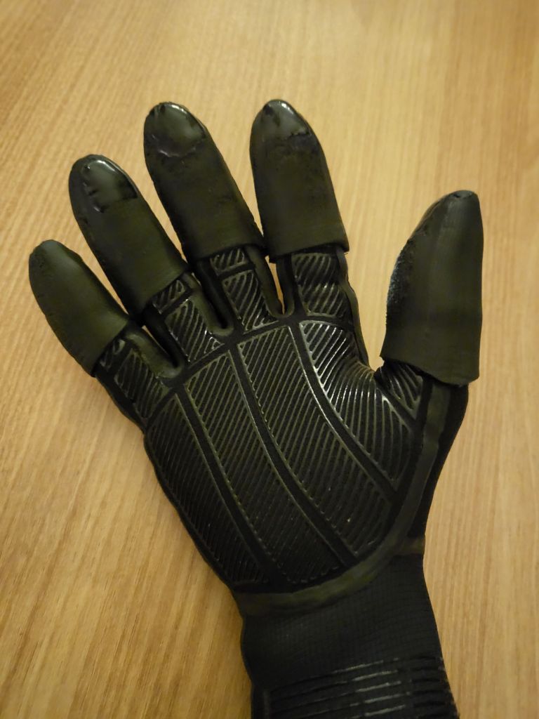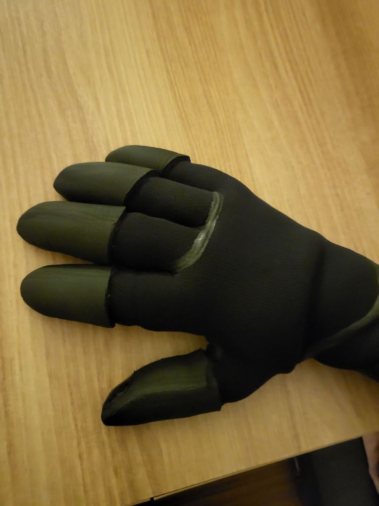 My idea: the weakest spot was fingertips. I found a pair of old gloves with holes and wears so I cut off the fingers and going to layer them on my 3mm. (Gosh I am so clever)