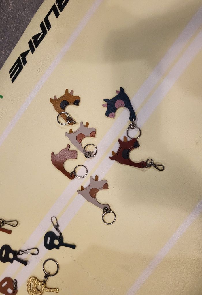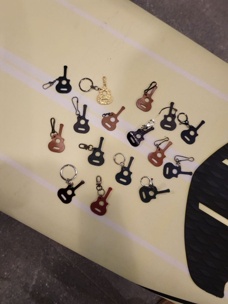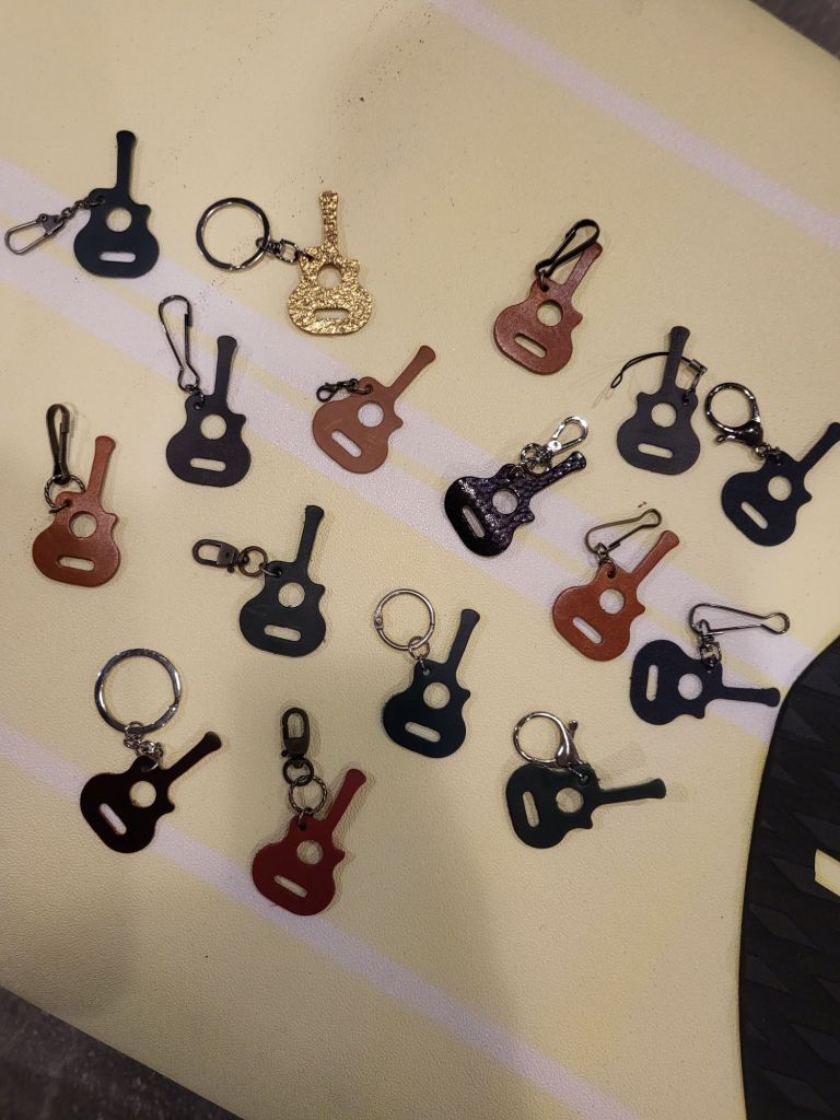 You can use leather cutters made of steel blades with wood covers : this is how to produce multiple of the same shape. I use Alibaba to purchase two cutters:cat shape and guitar shape.